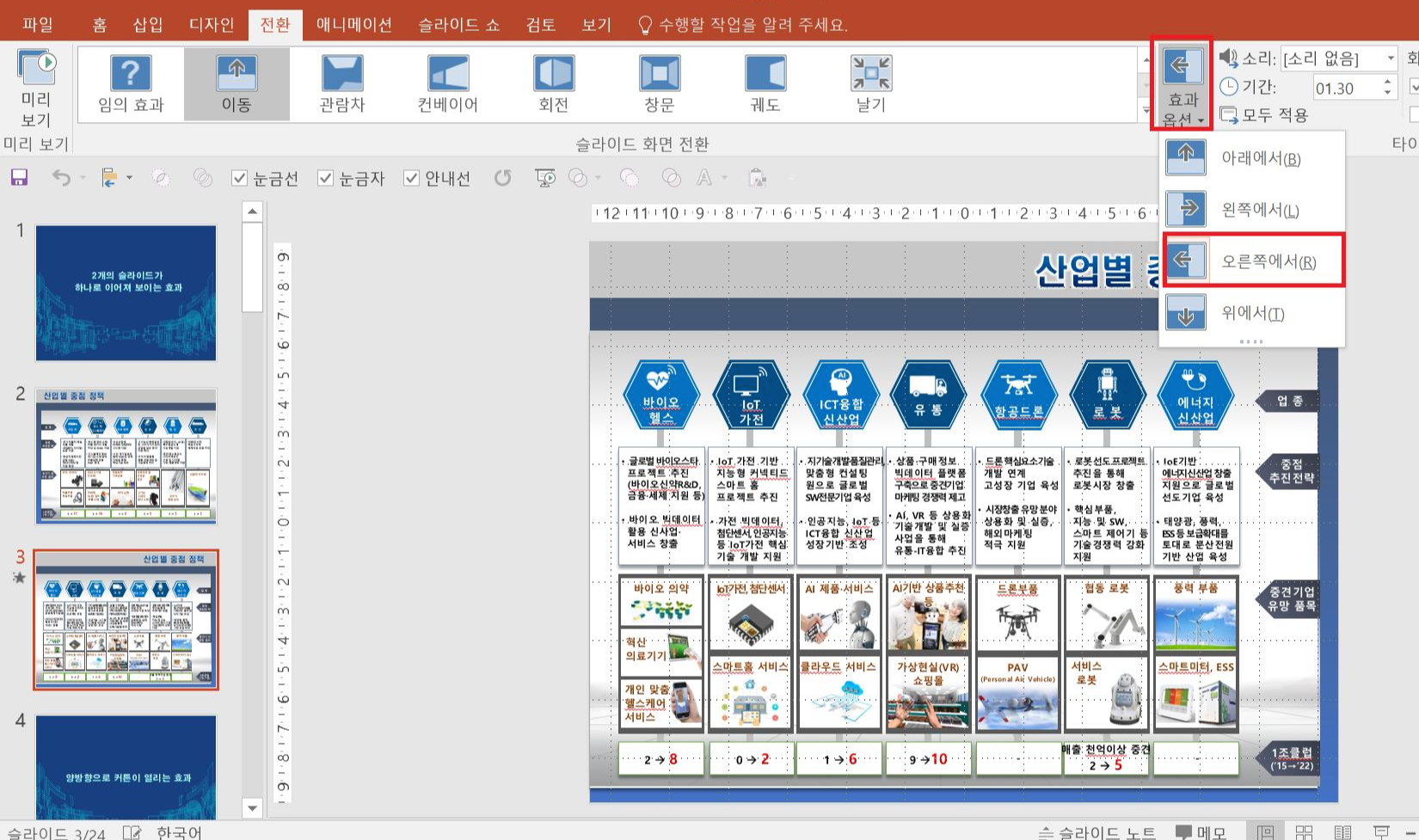 위 그림 3번 슬 라이디를 선택하고 [동적 콘텐츠] 영역에서 [이동] 효과를 클릭해 주십시오.