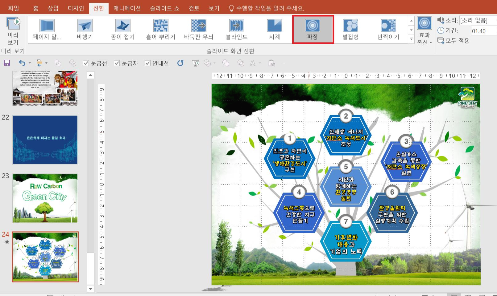 [화려한 효과] 영역 - [파장]을 적용하면 은은한 물결 파장을 일으키며 다음 슬라이드로 넘어가는 효과를 볼 수 있습니다